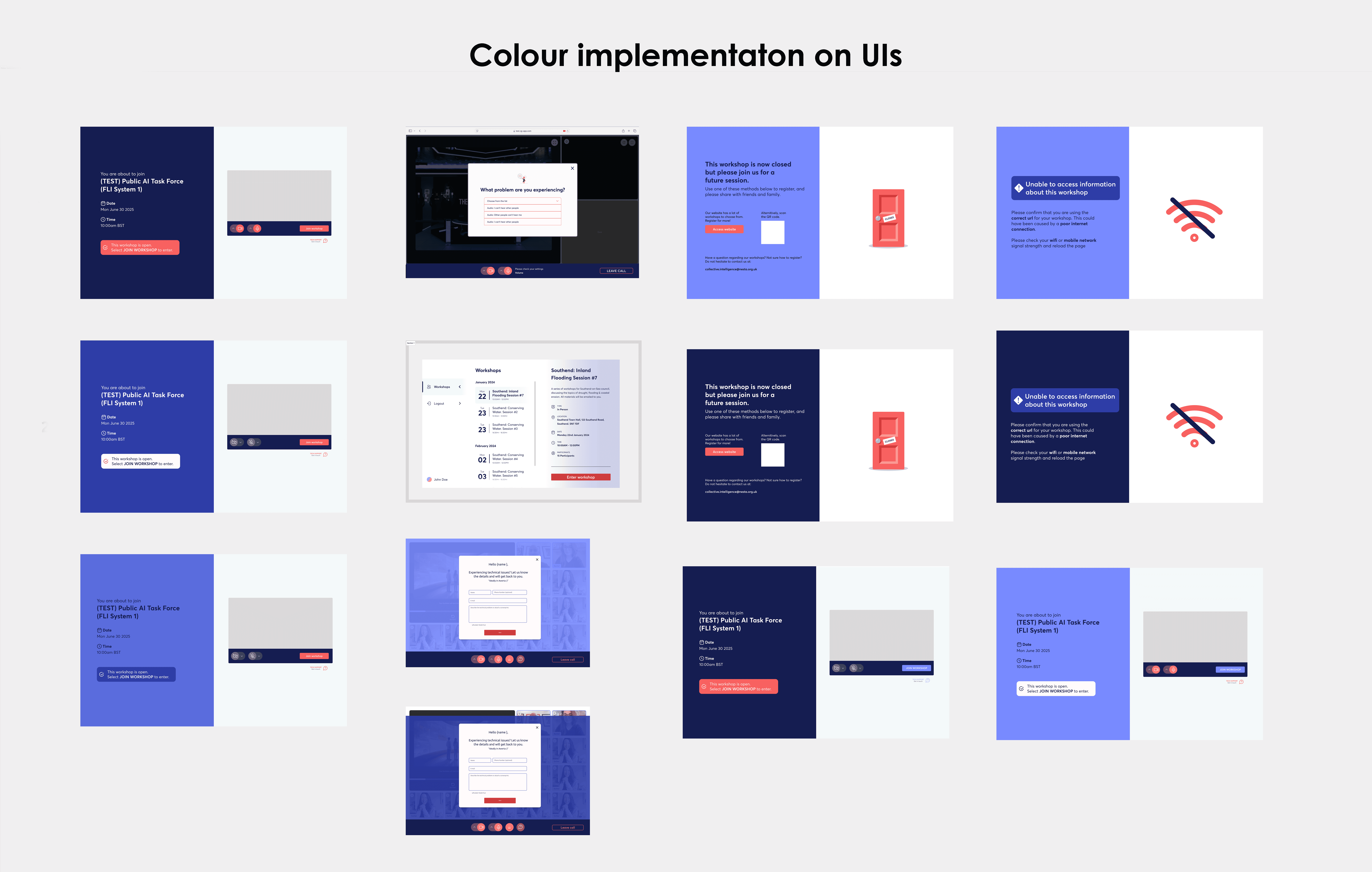 The color palette does not clearly signal hierarchy, actions, or system states. Key actions such as joining or continuing are not visually emphasised, while overlays reduce contrast and readability.