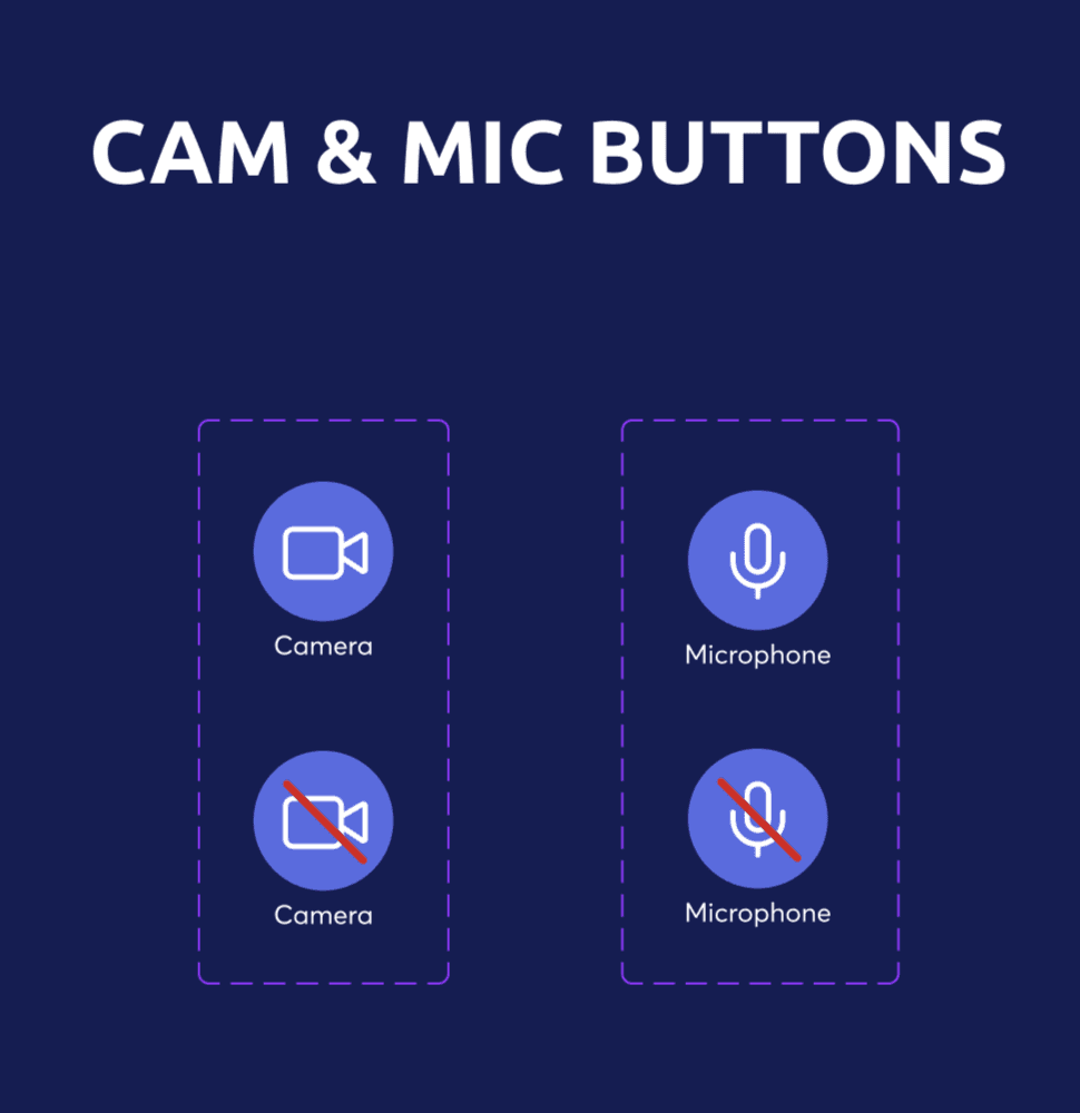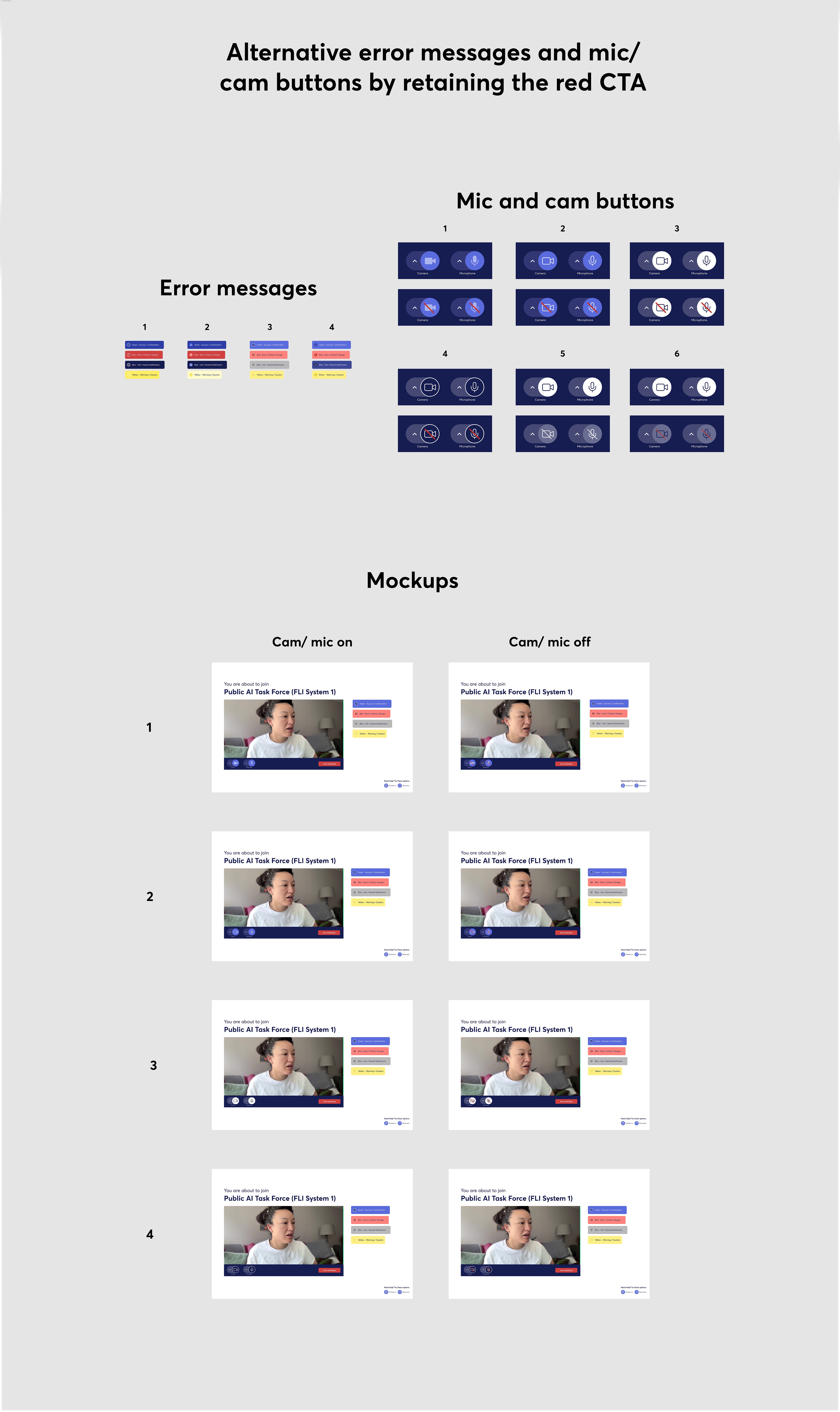 I explored camera and microphone states using familiar UI conventions, creating variations based on patterns from other calling platforms. A red line was used to indicate the off state; despite initial concerns with coral CTAs, the contrast made the meaning clear and unambiguous.