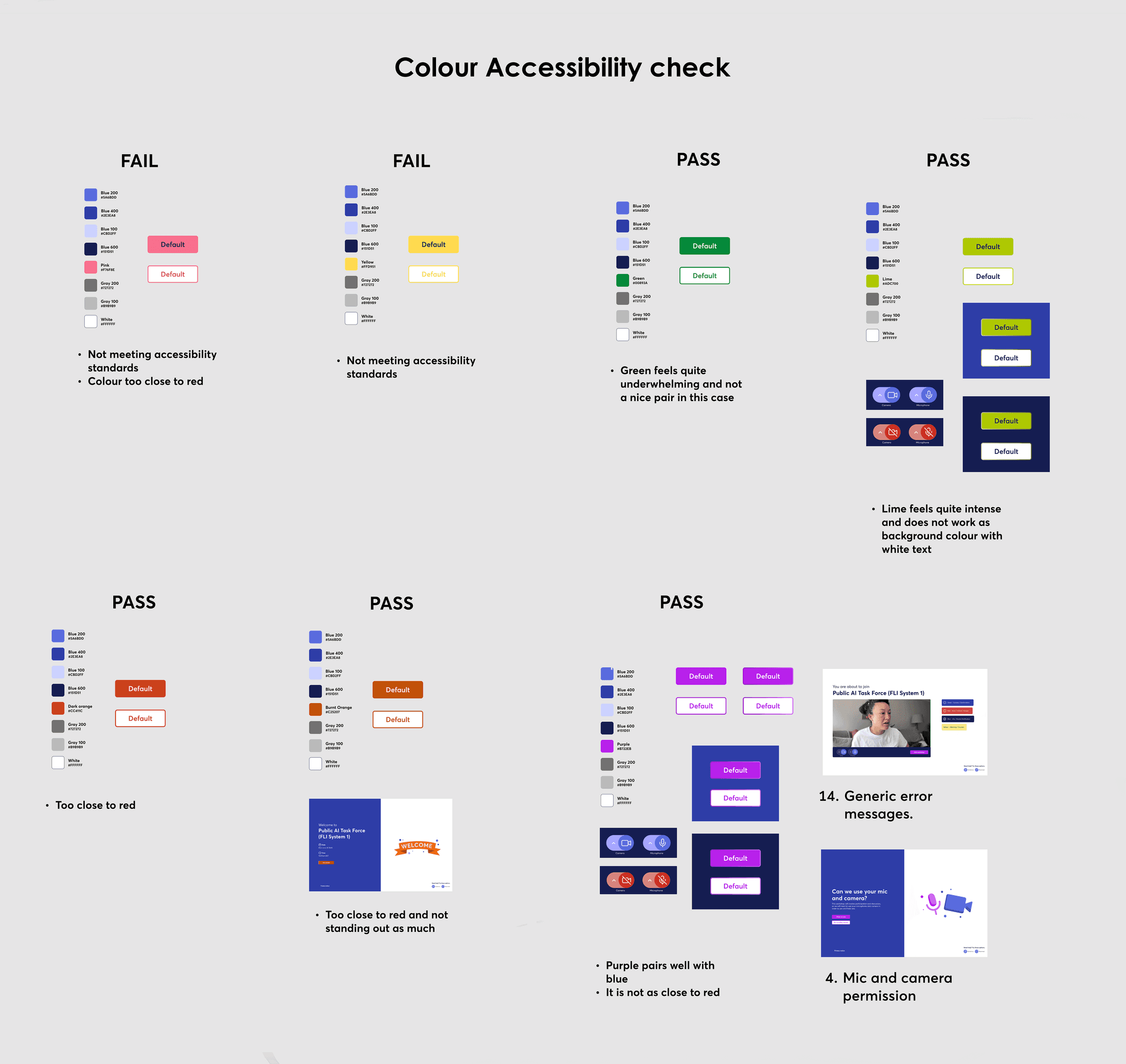 Several concerns were raised from the Design and Dev teams about how these colours might be perceived in the interface, especially when compared to common UI conventions used in traditional video calling platforms.