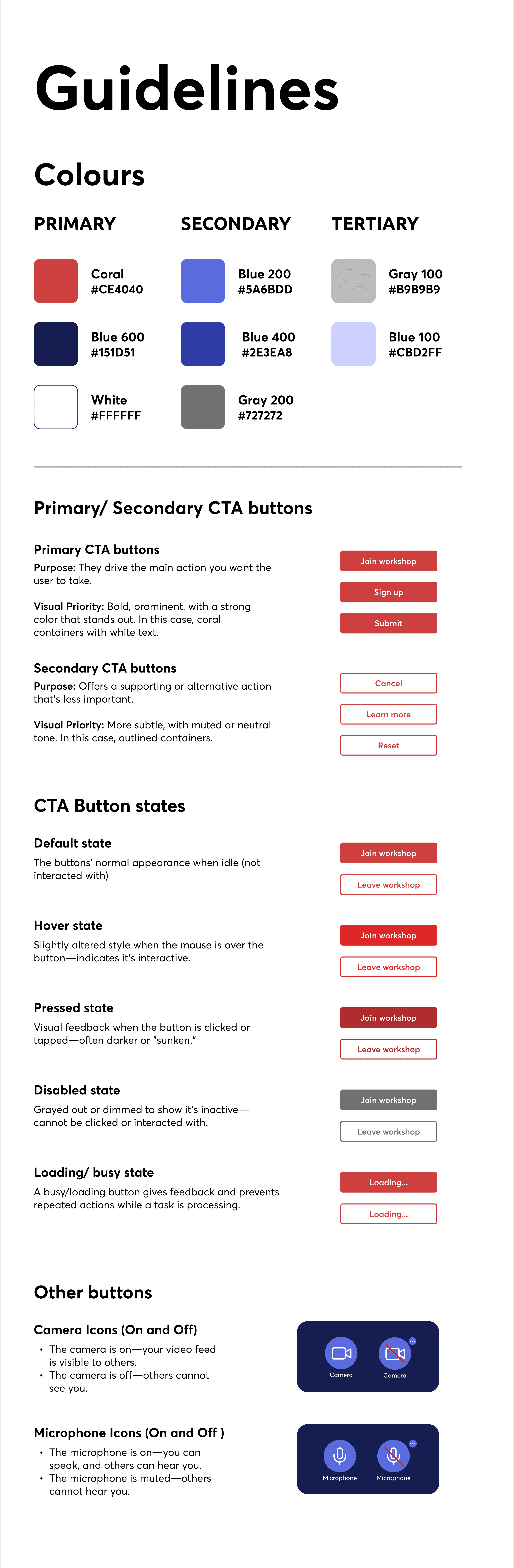 These insights informed a final set of guidelines covering colour, CTAs, mic and camera controls, iconography, and illustration. The system was designed to be clear, cohesive, and easy for both developers and designers to use and build on.